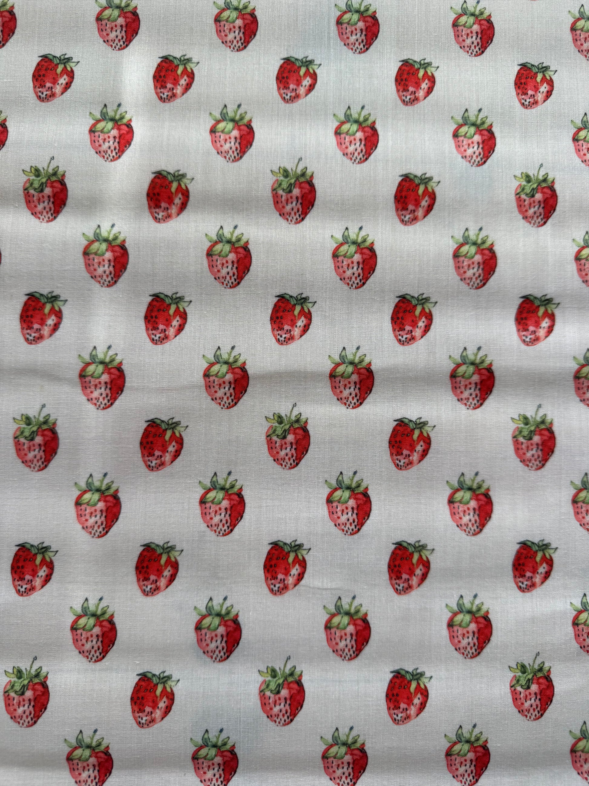 A wonderfully sweet and utterly irresistible Polycotton fabric from the Mindy brand, featuring a charming strawberry fields print that captures the sun-warmed, joyful abundance of a strawberry patch at the very height of summer. Smooth, easy to sew and brilliantly versatile, this polycotton blend is perfect for children's clothing, casual wear, summer dresses, pyjamas, tote bags, and any make that celebrates the simple, delicious pleasure of the season's finest fruit.